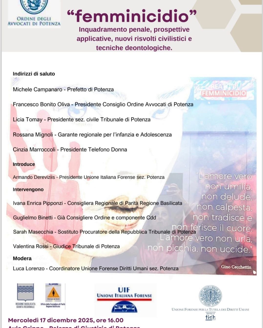 13.12.2025 “FEMMINICIDIO: INQUADRAMENTO PENALE, PROSPETTIVE APPLICATIVE, NUOVI RISVOLTI CIVILISTICI E TECNOLOGIE DEONTOLOGICHE”